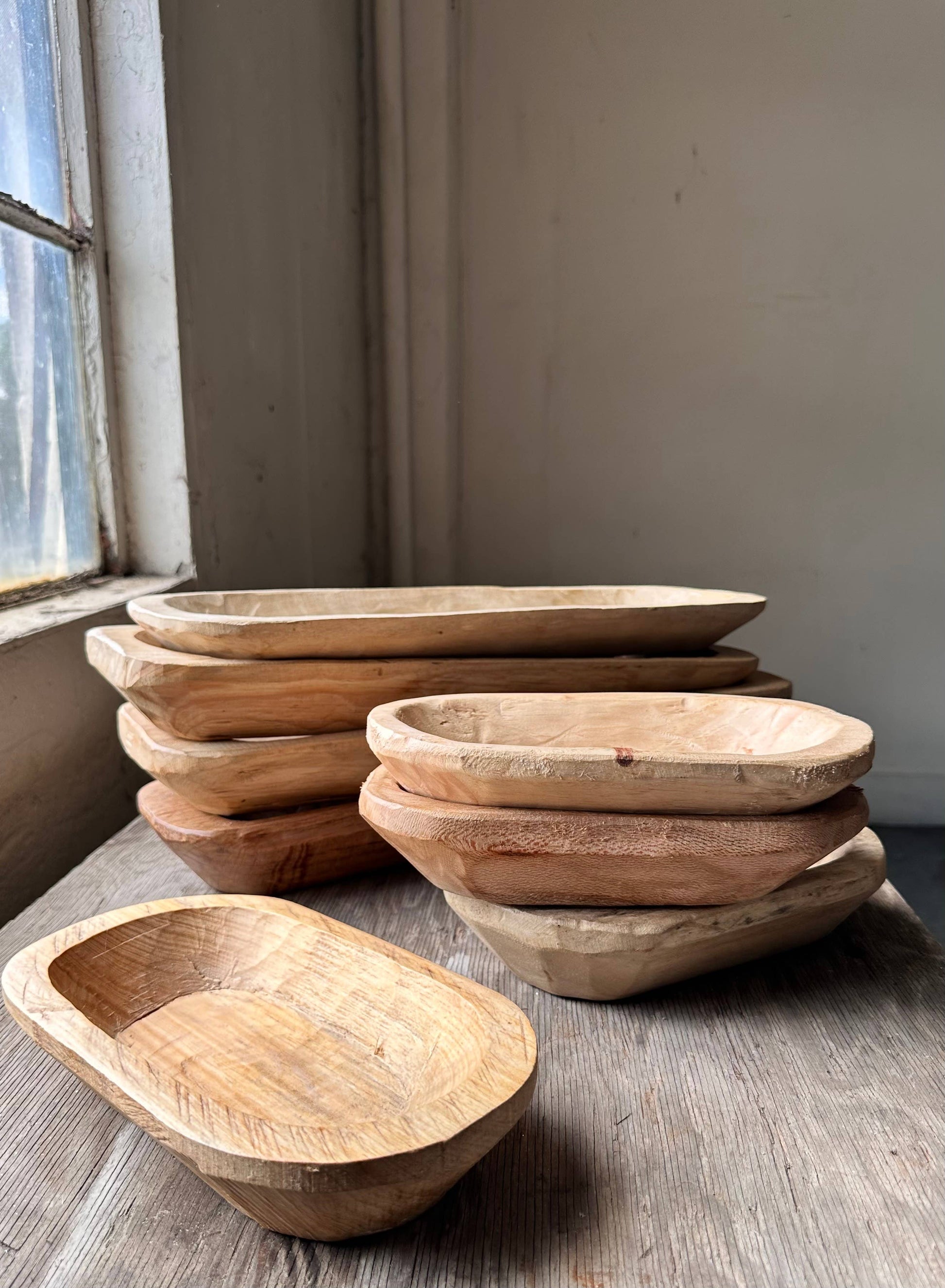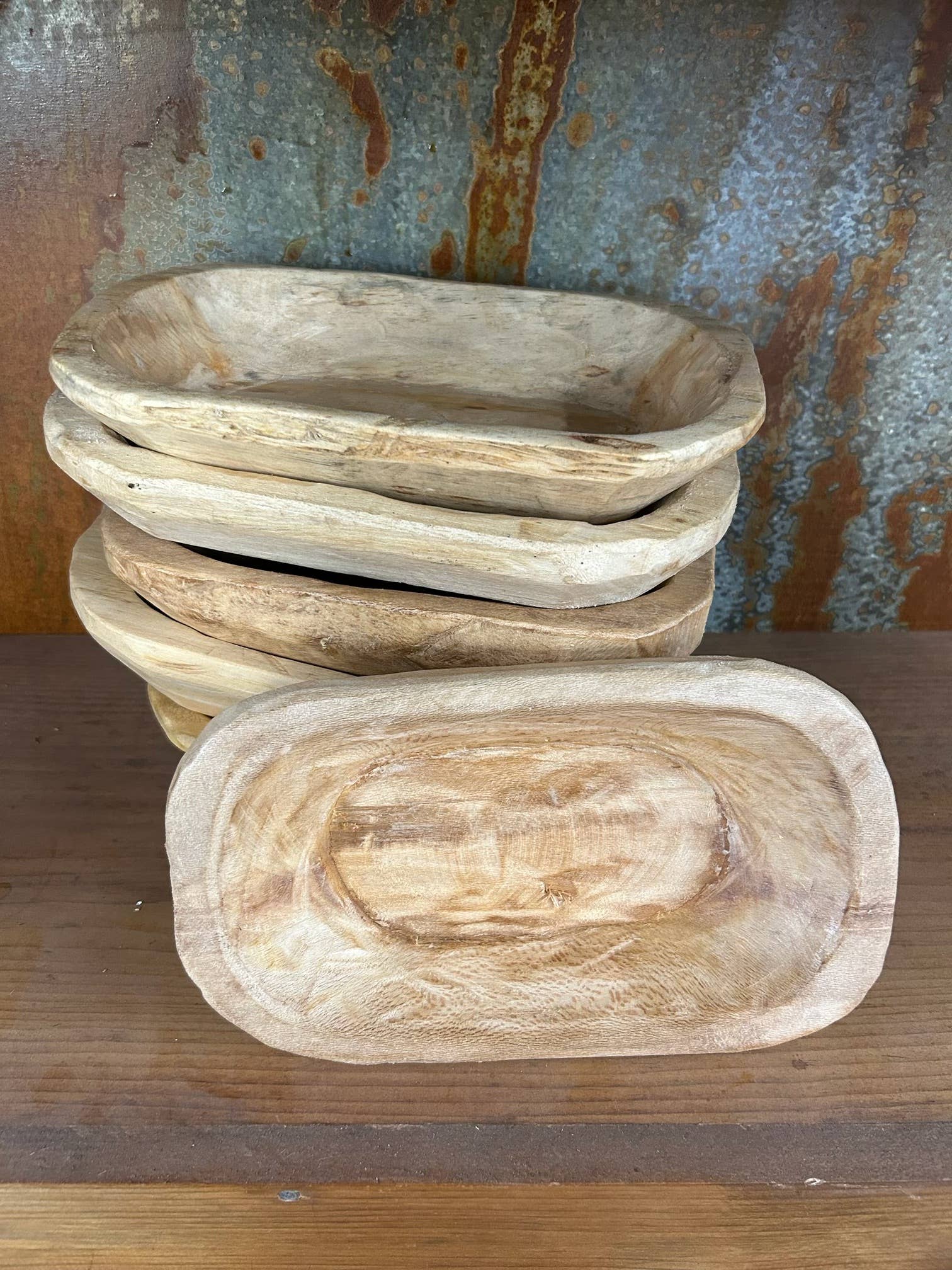 These small dough bowls are hand carved, and each one is unique. The natural beauty of the wood shines through the clear finish. They are approximately 9.5" long, 5" wide, 3" high.